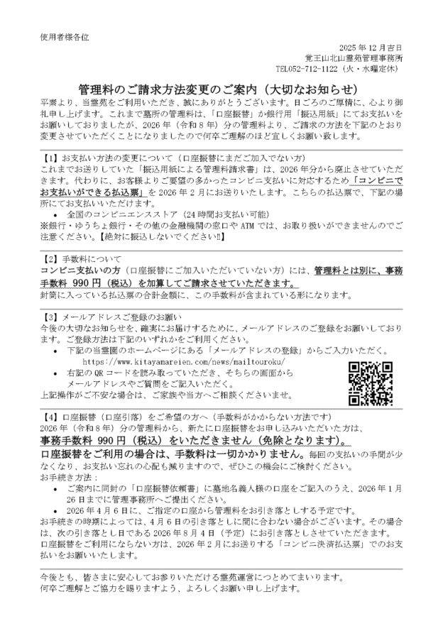 お知らせ 覚王山北山霊苑 HOME > お知らせ > 管理事務所からのお知らせ > 令和8年度北山霊苑だより 2026年02月08日管理事務所からのお知らせ 令和8年度北山霊苑だより その他のお知らせお知らせ一覧 2026年02月08日管理事務所からのお知らせ 令和8年度北山霊苑だより …続きを読む 2026年02月08日管理事務所からのお知らせ 管理料口座振替をご登録いただいていない方へ …続きを読む 2026年02月07日管理事務所からのお知らせ 北山霊苑本堂にて節分会を執り行いました 暦の上では春となりましたが、まだまだ寒さの残る中、北山霊苑本堂にて「節分会(せつぶんえ)」を執り行い…続きを読む お知らせをすべて見る カテゴリー別記事 イベント開催情報 管理事務所からのお知らせ 【重要】使用者様へのお知らせ 霊園花だより コラム